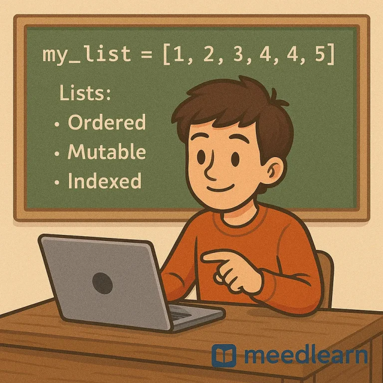 ابتدا یک لیست خالی ایجاد میکنیم و در یک حلقه ۵ بار از کاربر مقدار میگیریم. با append() مقدار هر بار به انتهای لیست افزوده میشود. در نهایت، کل لیست را با print() نمایش میدهیم.